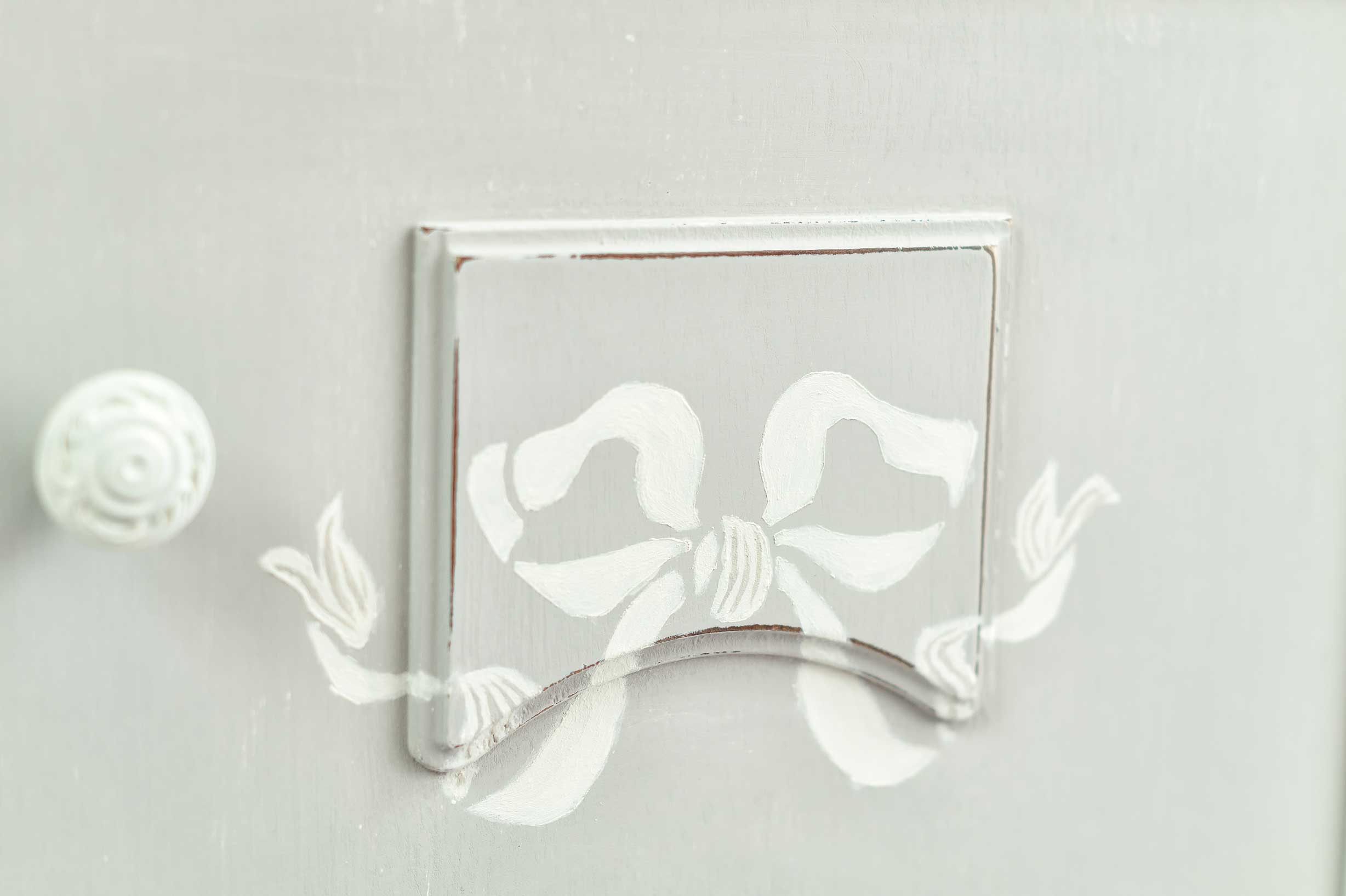 Le tecniche dello Shabby hanno un grande potere di trasformazione. Chi non può acquistare mobili nuovi o nei mercatini può rinnovare, con una piccola spesa, quelli che già possiede. Ecco un esempio! Questo mobile da ingresso, privo di personalità, si trasforma, rinasce con i toni delicati del bianco e del grigio, si ingentilisce con i due fiocchetti dipinti a mano racchiusi in sottili cornici bianche.